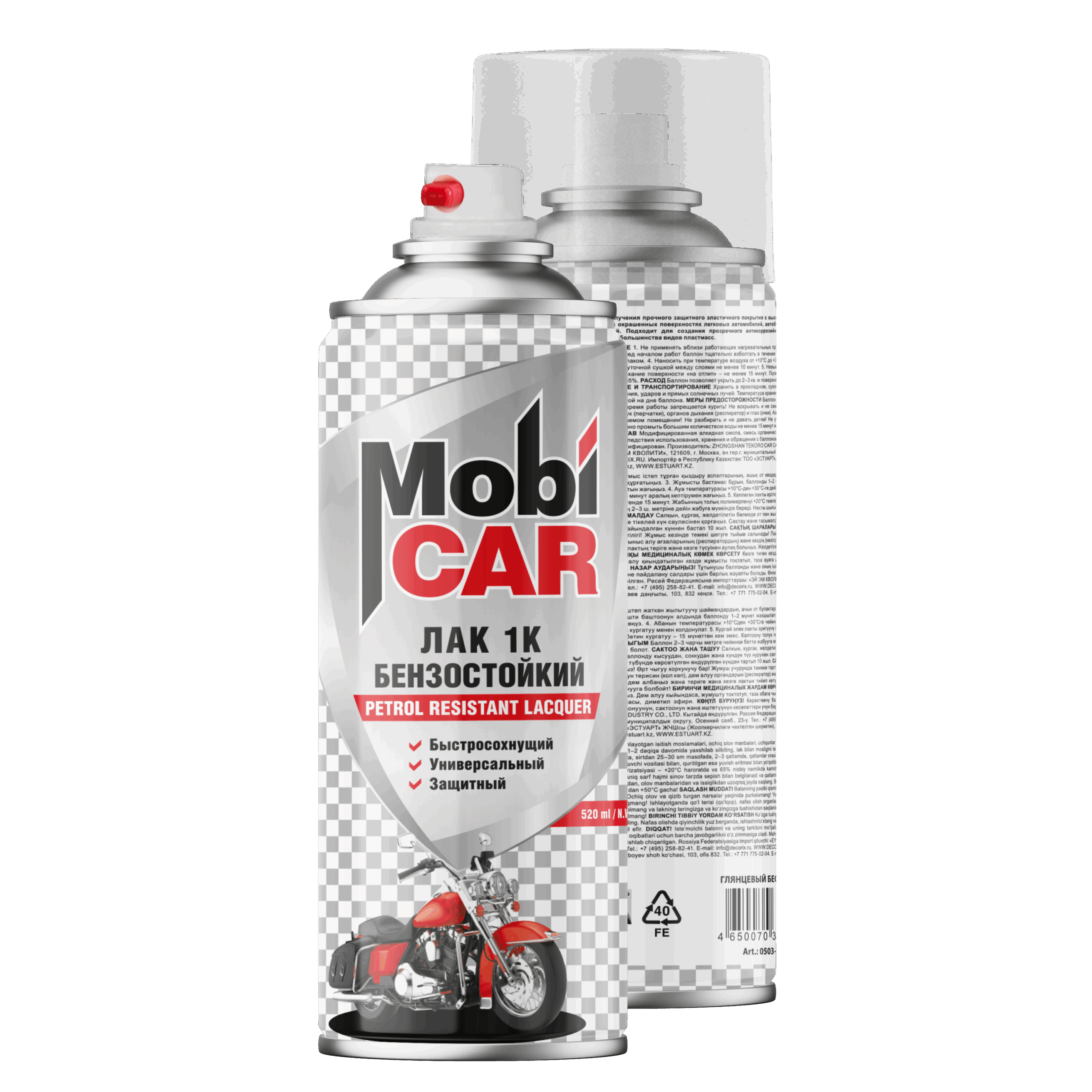 Профессиональный бензостойкий автолак MobiCAR® предназначен для получения прочного защитного эластичного покрытия с высокой стойкостью к бензину и большинству органических растворителей. Применяется на окрашенных поверхностях легковых автомобилей, автобусов и бензобаках мотоциклов. Совместим с большинством автомобильных покрытий. Подходит для создания прозрачного антикоррозийного покрытия на металлических поверхностях и для лакирования древесины, керамики и большинства видов пластмасс.