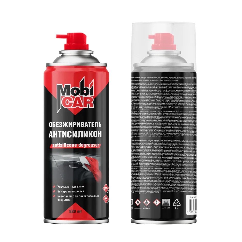 Обезжириватель-антисиликон универсальный, 520 мл Mobicar 0525-01 MC предназначен для удаления смазочных материалов, силиконов, масляных, восковых и жировых загрязнений с различных поверхностей перед последующим окрашиванием. Идеально подходит для подготовки поверхности перед склеиванием. Не взаимодействует с лакокрасочным покрытием, резиновыми и пластмассовыми деталями.